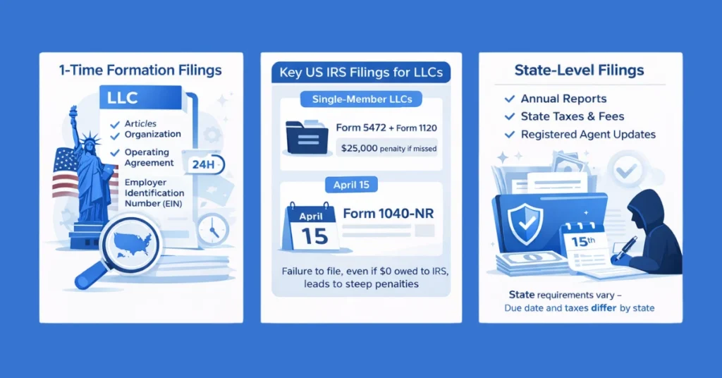 The filing requirements for a non-resident US LLC are more comprehensive than most formation services tell you. Form 5472 penalties alone – $25,000 per missed filing – have cost uninformed founders more than their entire year’s revenue. State dissolution from a missed annual report has triggered payment processor freezes that disrupted operations for months.