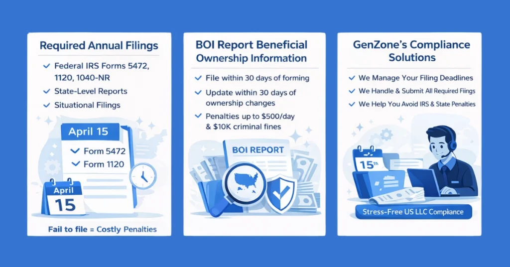 Who this guide is for: You are a non-US resident who owns, or is forming, a US LLC – single-member or multi-member. You want to understand every filing you are responsible for, when it is due, what happens if you miss it, and which parts GenZone handles for you.